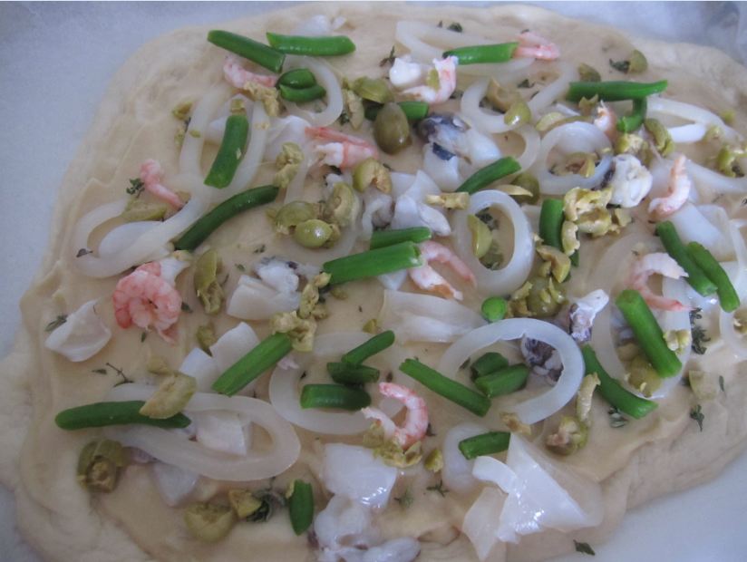 А сверху выложила нарезанный кольцами кальмар, немного креветок, немного зеленых оливок, несколько каракатиц и стручковую фасоль