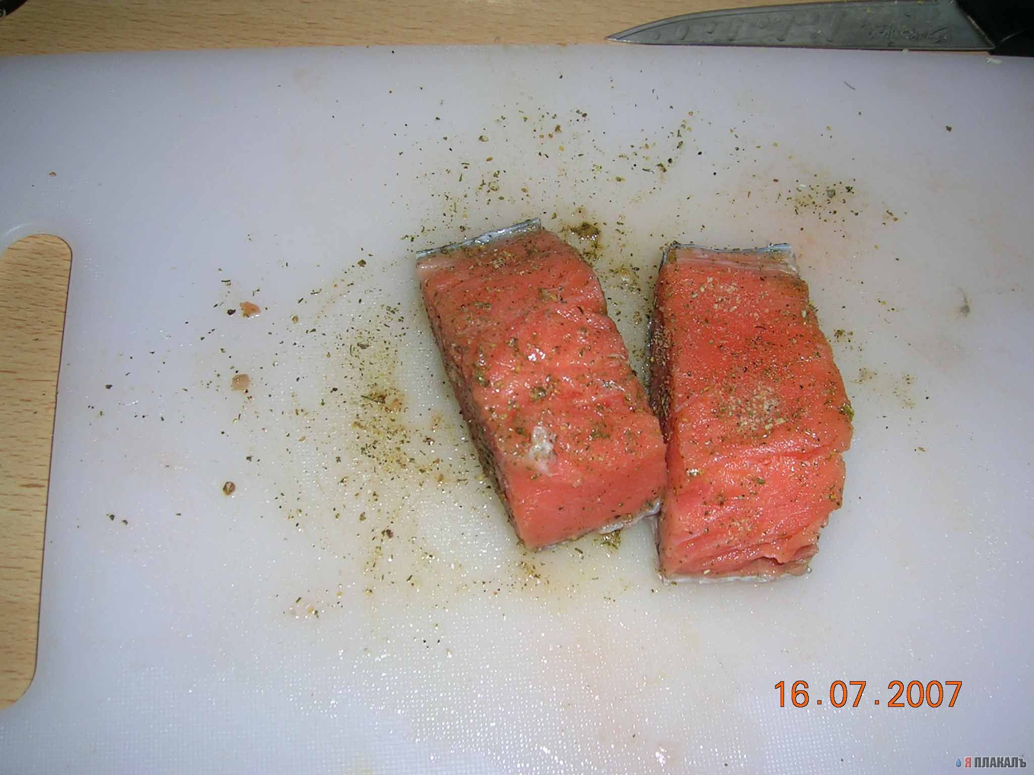 Рыбку режем на порционные куски и натираем со всех сторон любой приправкой для рыбы.