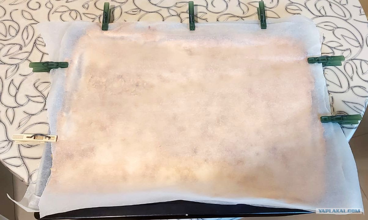 Вчера готовил очередной рулет и применил прищепки для фиксации бумаги при переворачивании, что бы меньше лепестков рассыпалось вокруг, довольно удобно получилось.