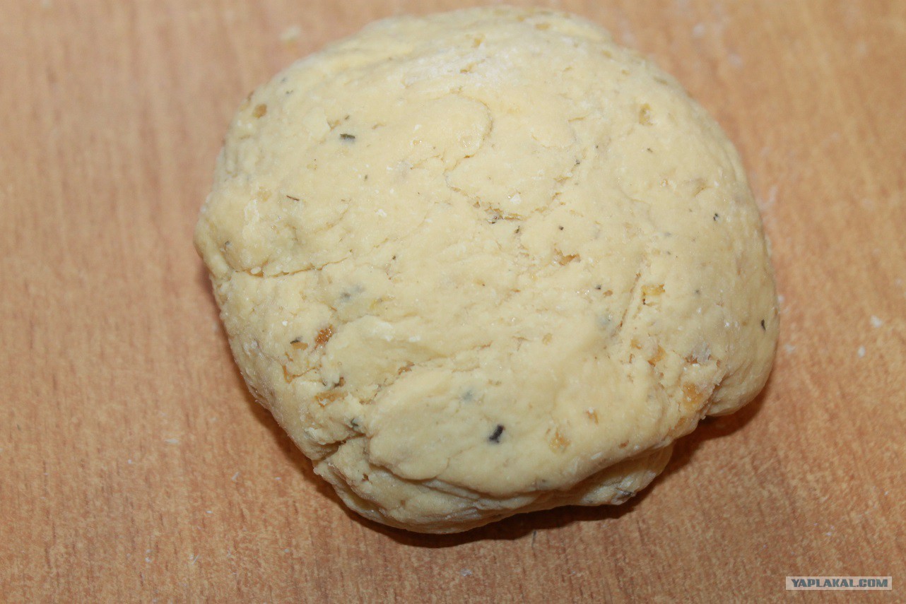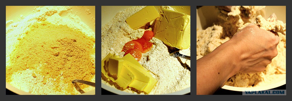 Усиленно вымешиваем. Пока не получится упругое песочное тесто. Обматываем его пищевой плёнкой и отправляем в холодильник на 1 час.
