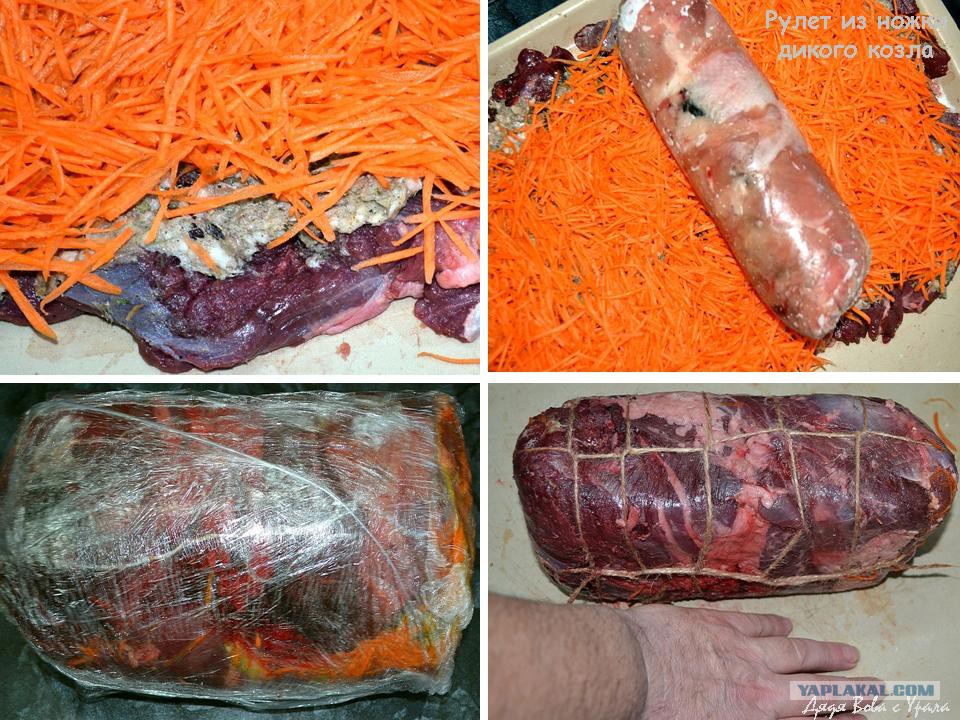 Через пару часов Снимаем плёнку и обвязываем рулет шпагатом. Всё. В таком виде оставляем его в прохладном месте, чтоб разморозилось то, что было подморожено, ну и чтоб соль и пряности распространились внутри рулета. Короче- на ночь!