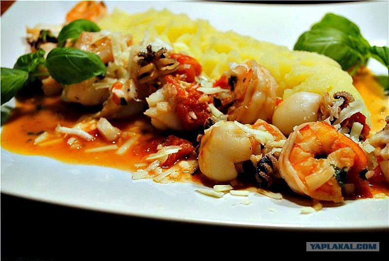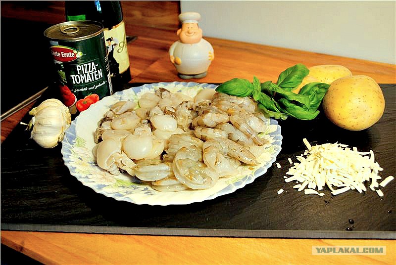 Собственно каракатицы, креветки и треска, помидоры , чеснок, пармезан, белое вино и базилик. А так же хорошее настроение.