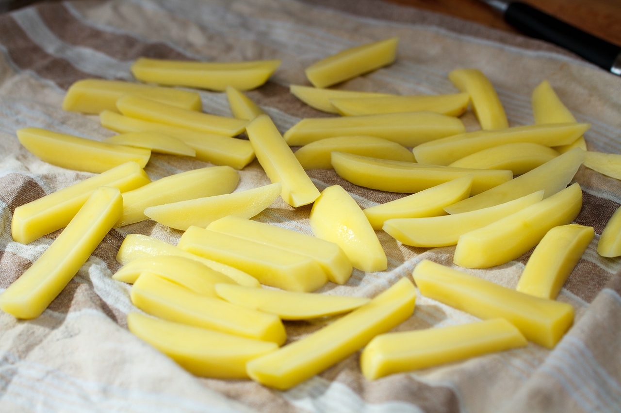 далее займемся картофелем фри. тут все не так просто, как кажется на первый взгляд. правильный бельгийский фри должен быть длиной 45 см фритироваться 2 раза в говяжьем смальце (только где его взять?). у меня обычное растительное масло. первый раз фритируем при 140-150° практически до готовности. второй раз при 180° до хрустящей корочки. однако все по порядку.
