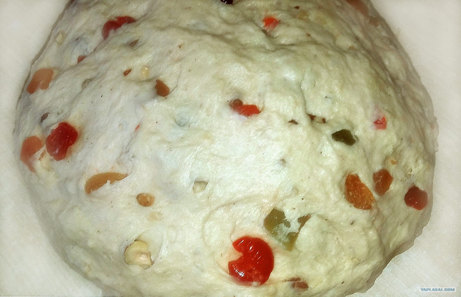 НАЧИНКА: цукаты, изюм, залить горячей водой на 30 минут. Обсушить. Я заливала на ночь сухофрукты 150 мл коньяка. За это время они вобрали алкоголь полностью и набухли, поэтому я горячей водой не заливала.