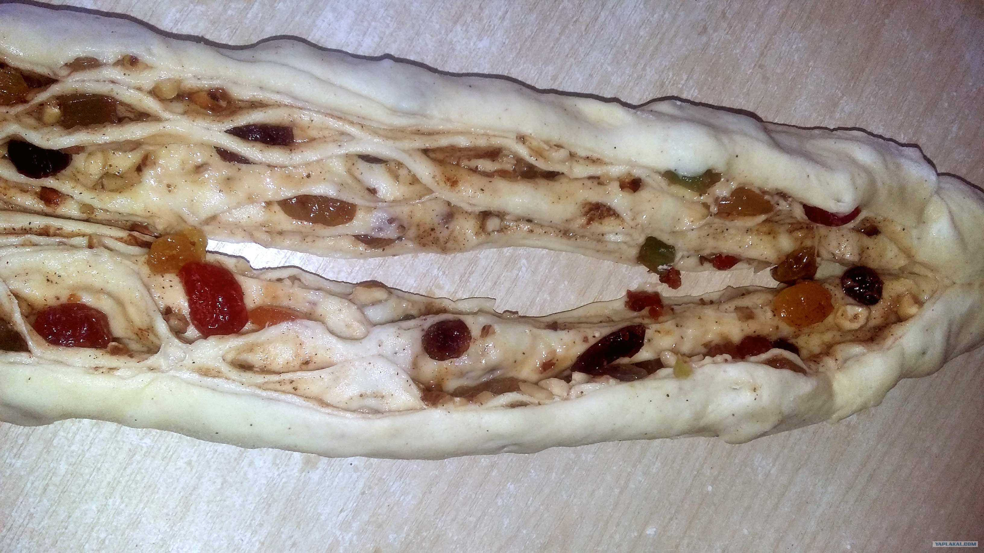 смазала маслом, посыпала корицей и распределила те же орехи и цукаты по верх теста