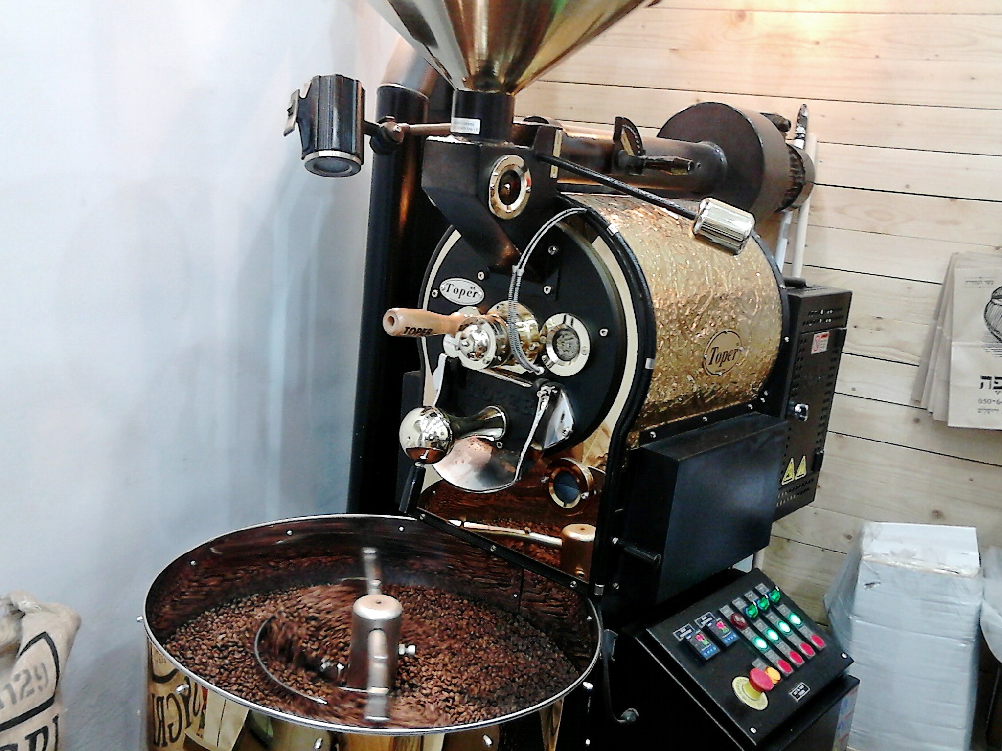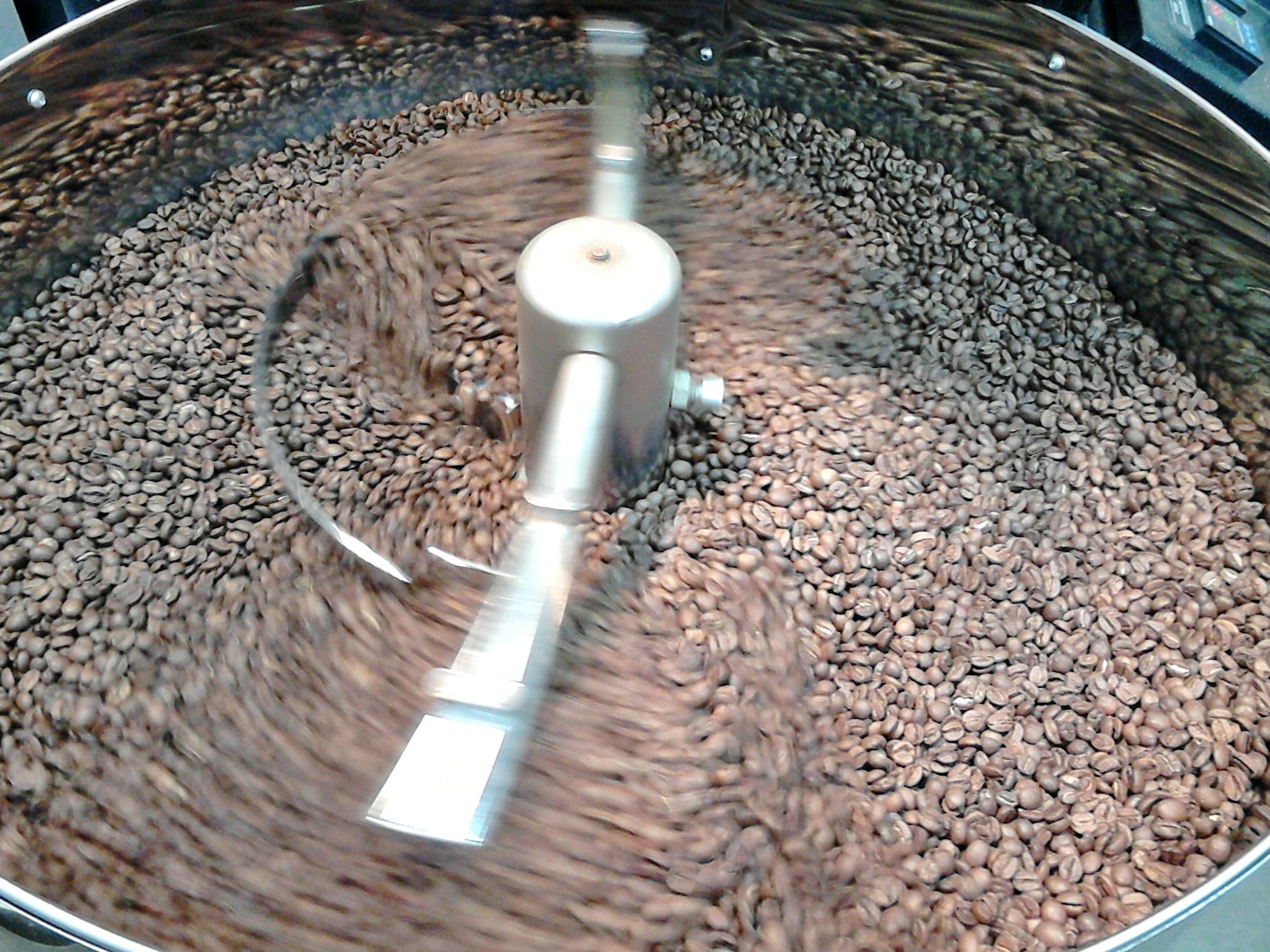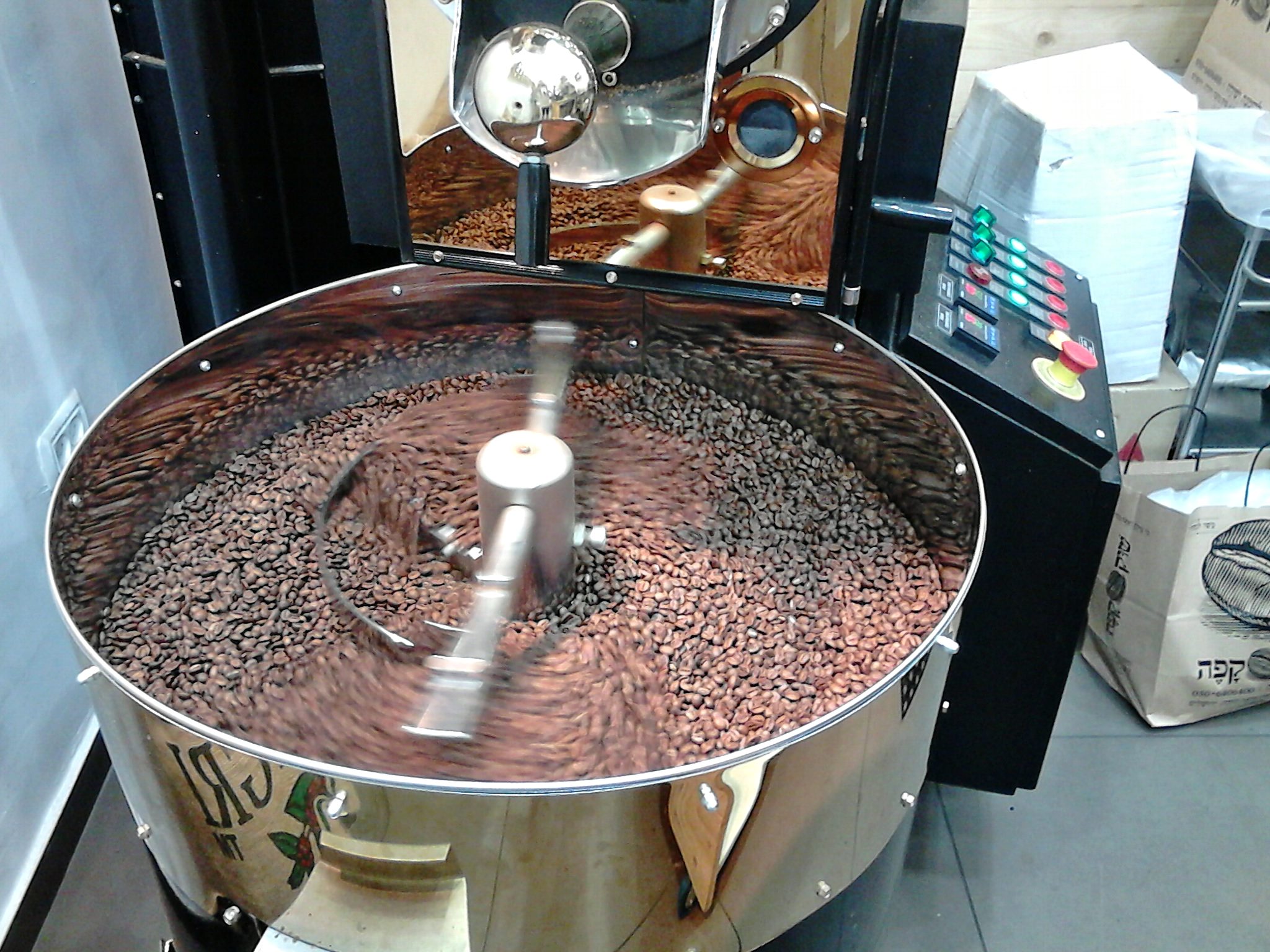 Там у них машина для жарки кофя - такой здоровенный типа паровоз, в него засыпают зелёное и он жарит. Запах стоит охупупительный!