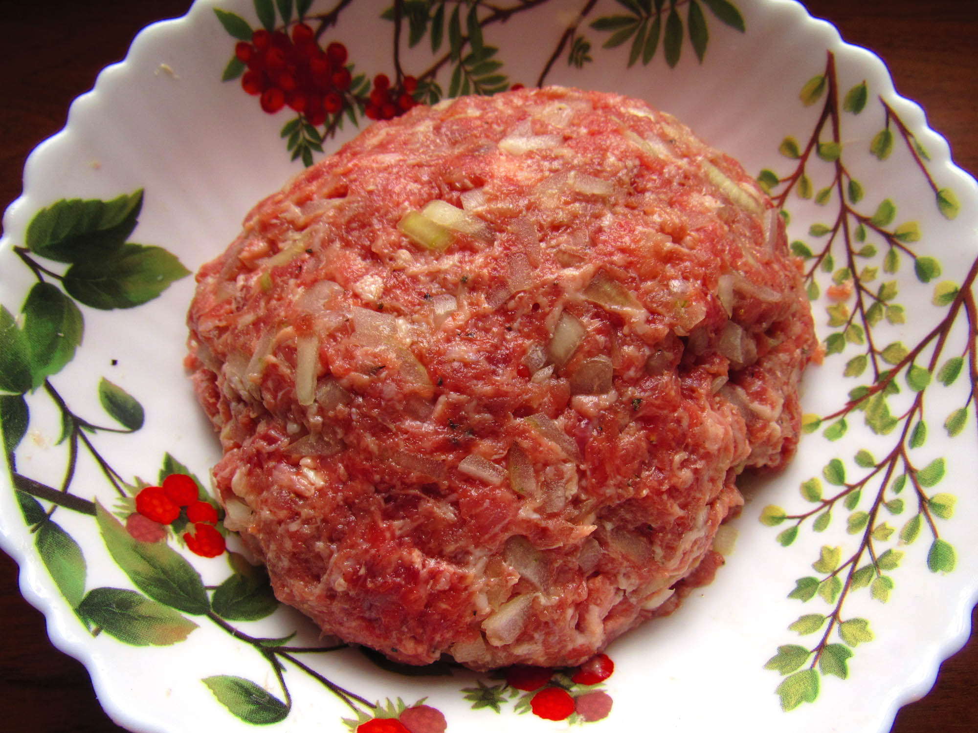 2. Добавляем лук в предварительно охлажденный фарш, солим, перчим.