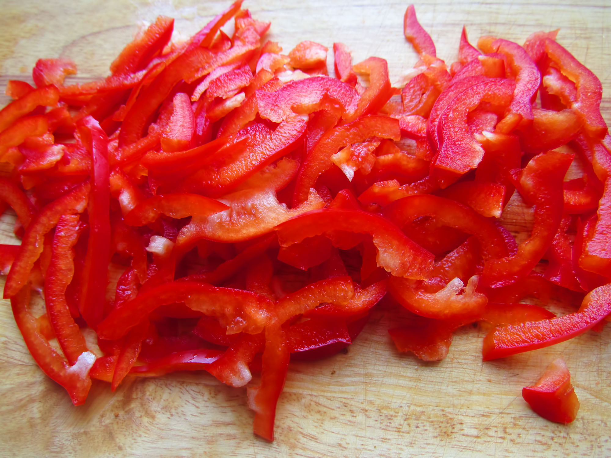 6. Сладкий перец нарезаем тонкой соломкой, можно воспользоваться картофелечисткой.