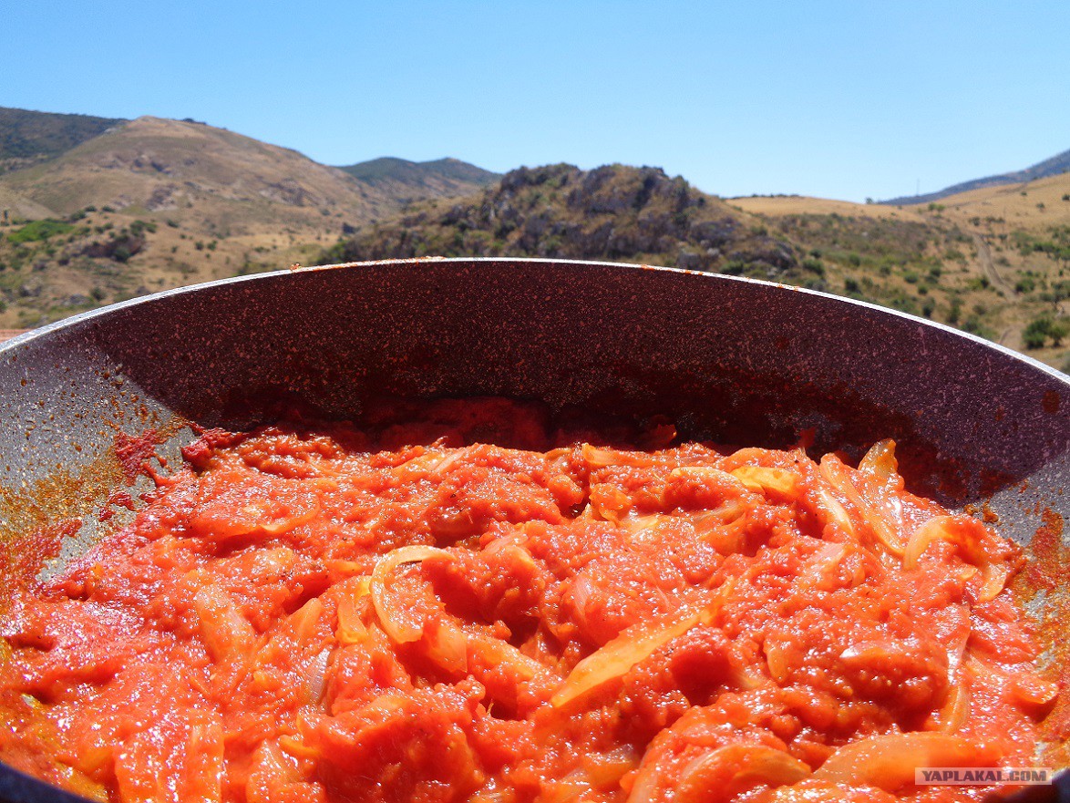 Через 10 минут добавляю помидоры и тушу всё вместе ещё 20 минут. Добавляю соль и перец. Соль — очень осторожно, потому что среди ингредиентов будут весьма солёные, а перец — щедро, пусть будет!