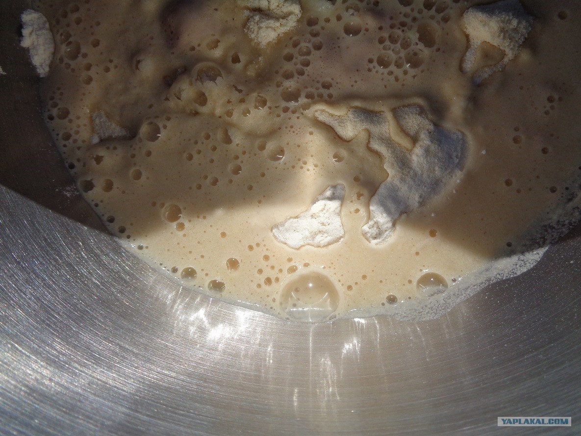 В (желательно просеянную) муку вливаем дрожжевой раствор и остальную воду.