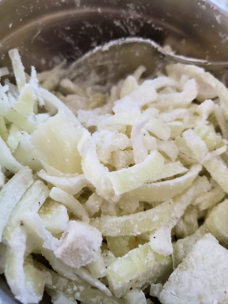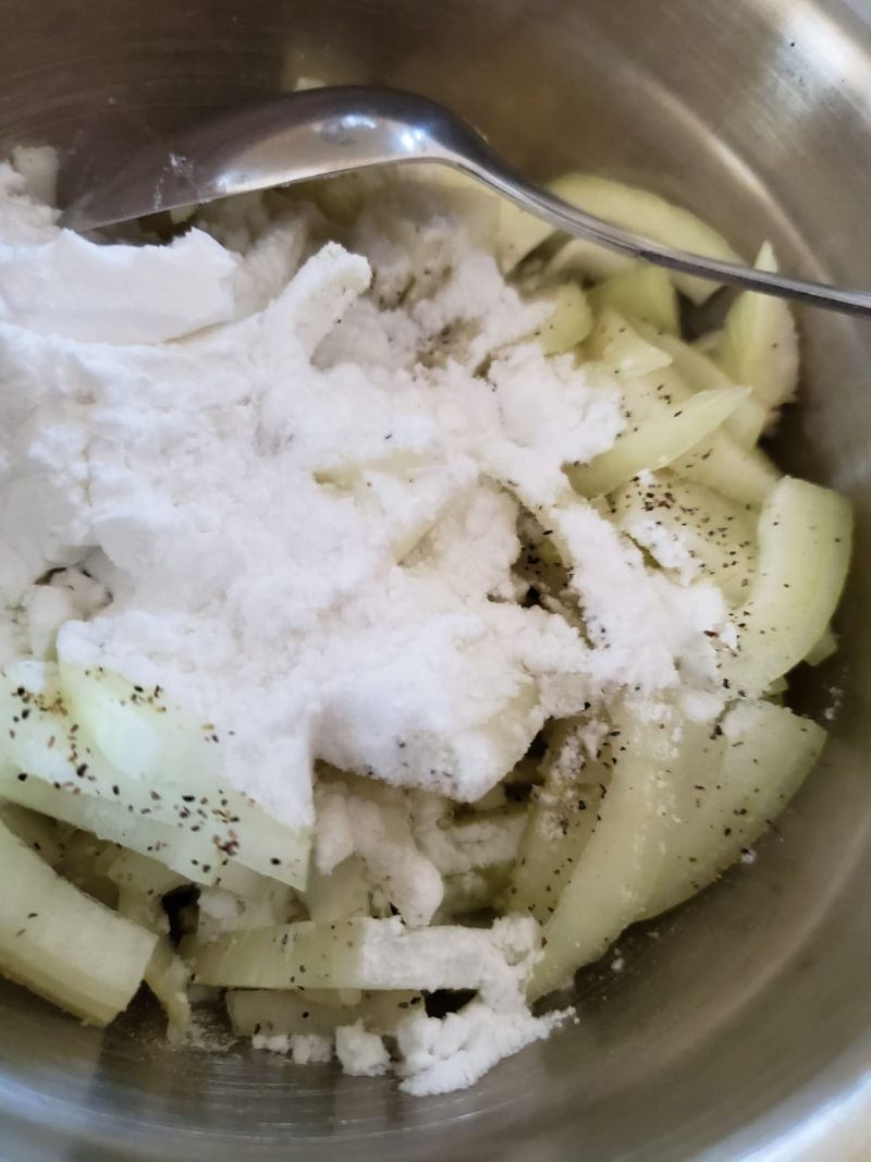 Я решила сделать лук. Порезала( наверное крупновато). Добавила соль-перец и крахмал.