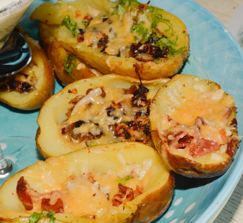 Беру картошку, мою, разрезаю пополам, выгребаю середину накладываю на тарелку , поливаю маслом или жирком слегка и в микроволновушку. на пять минут? Опытным путем - вытаскиваешь - тыкаешь вилкой. Но полюбасу - после на противень и начиняешь - что в голову взбредет. И финишем - сыром посыпать..ну или ломтика кусочек. Главное что то покласть внутрь что жирненькое или влажное - типа маргарина или сливок. Так как картошка уже почти готова - то в духовке только для расплавления сыра - смотрите через стекло сами.