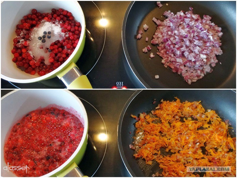 Поставил на плиту бруснику и параллельно обжарил лук с морковкой. Недолго, до прозрачности лука.