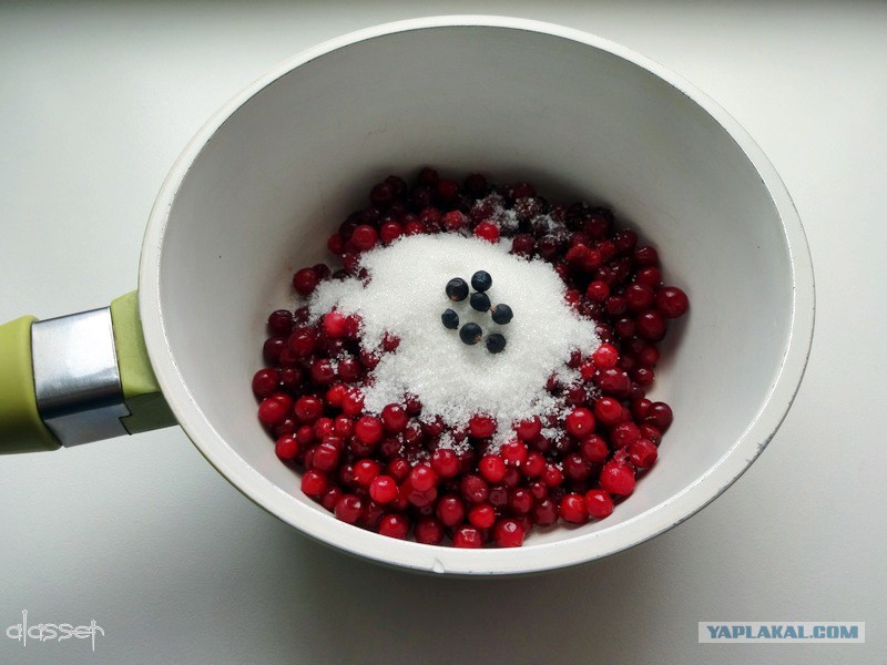 Насыпал бруснику в ковшик, добавил сахара 2-3 столовых ложки и щепотку соли, совсем немного воды.