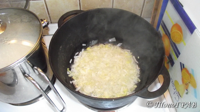 Режем лук порей и обжариваем его в казане до золотистого цвета. Это будет у нас начинка для пампушек
