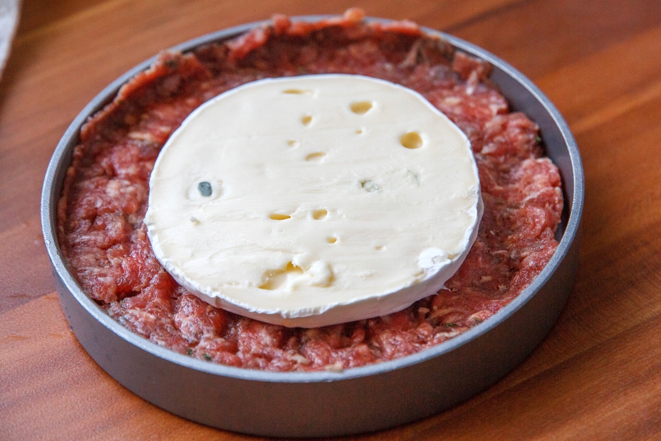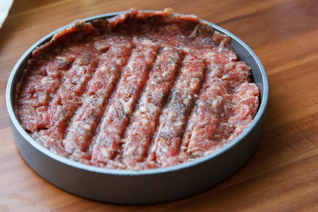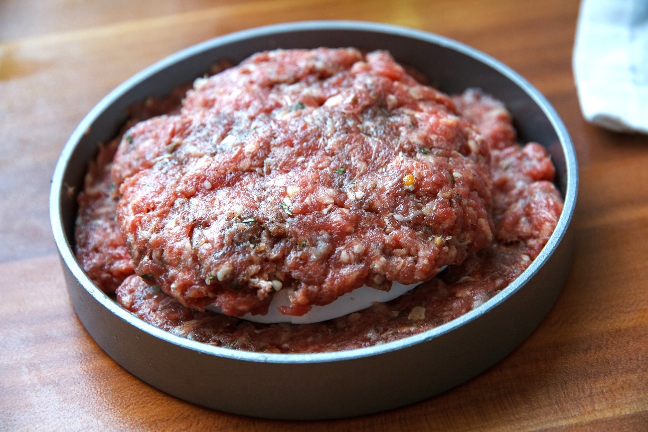 фарш делим на 8 частей и каждую часть еще пополам. одну половину кладем на дно девайса. чтобы фарш не прилипал, можно смазать дно растительным маслом или выстелить пищевой пленкой.
