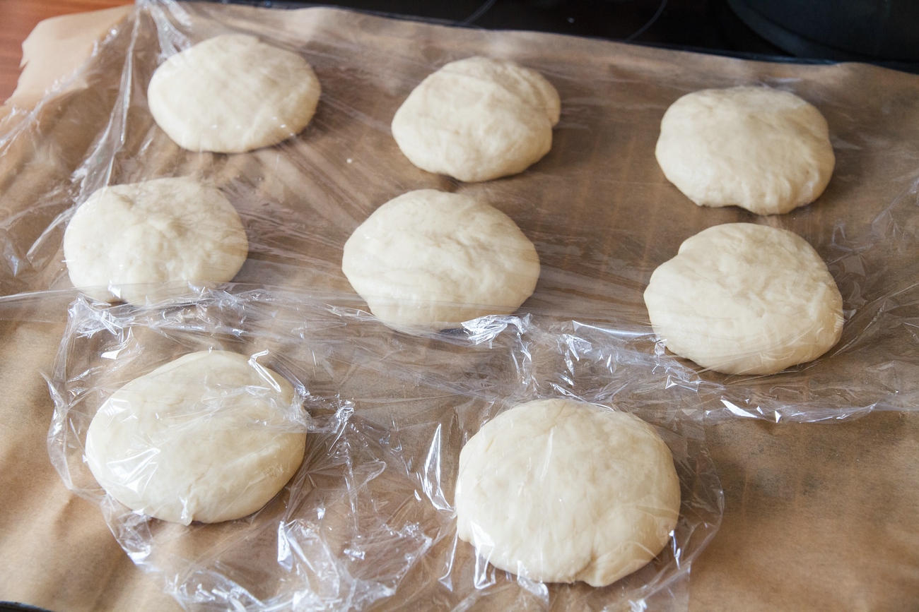 тесто тем временем подошло. делим на 8 частей, придаем форму шарика и выкладываем на пекарскую бумагу. слегка придавливаем в лепешку, накрываем пленкой и даем постоять еще пол часа