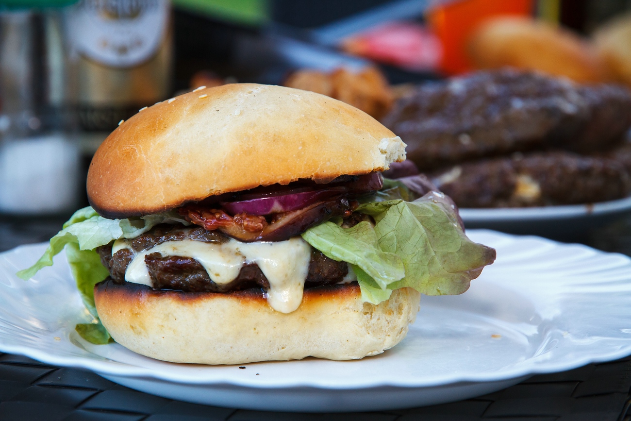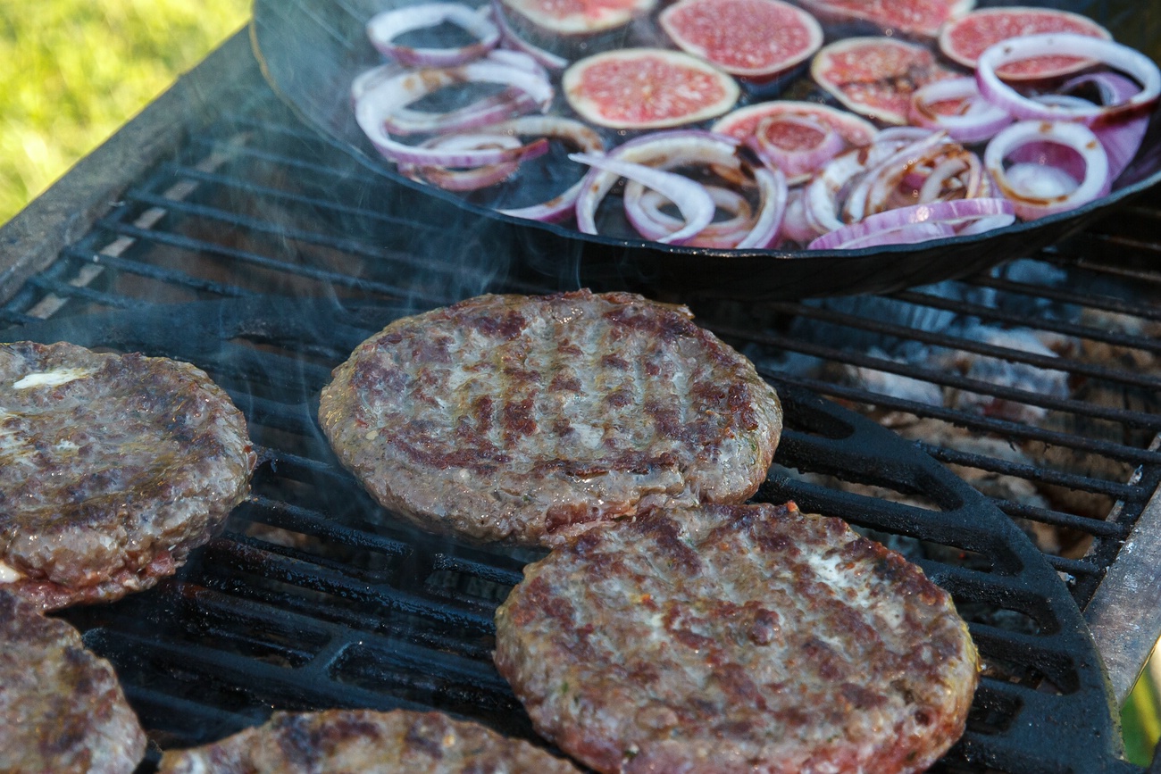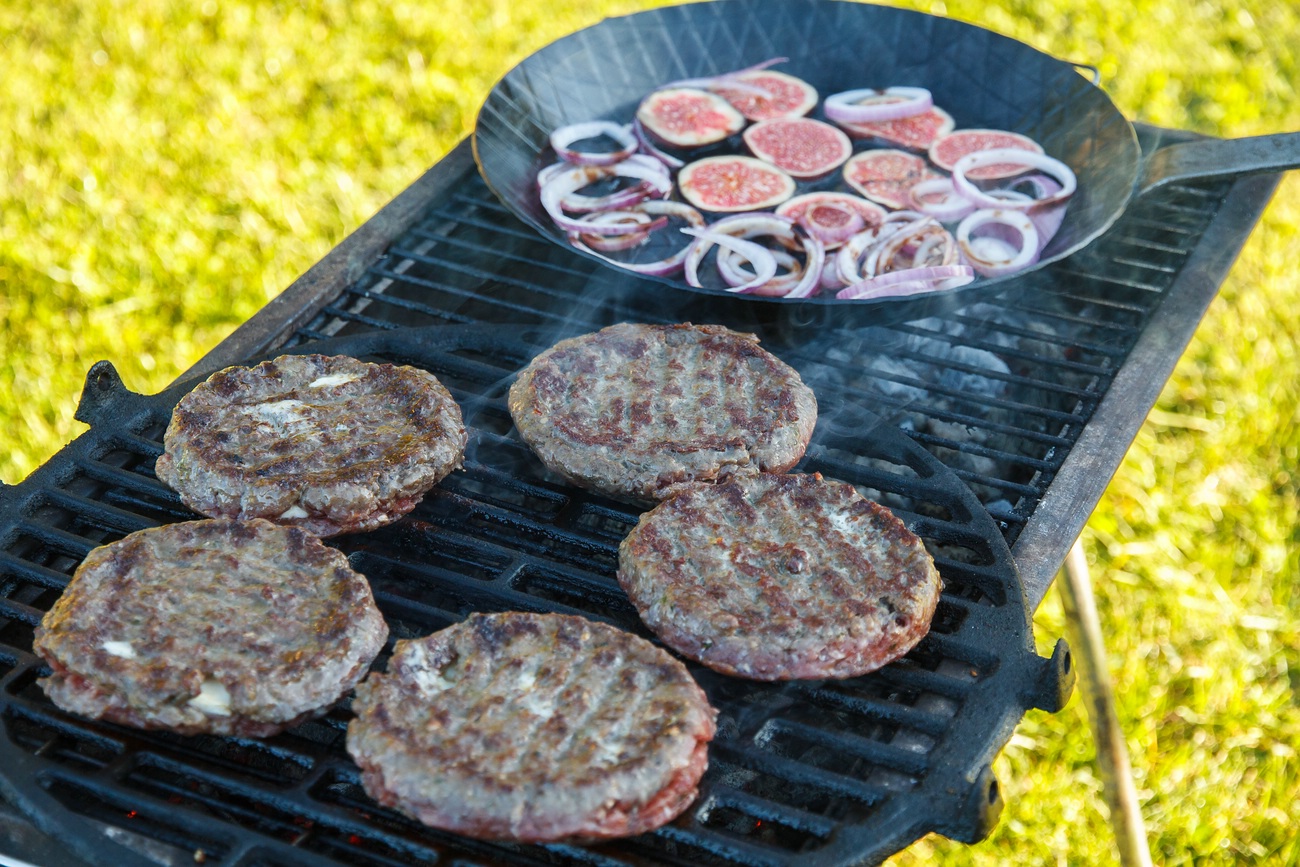 разогреваем чугунную решетку и отправляем первую партию бургеров на мангал