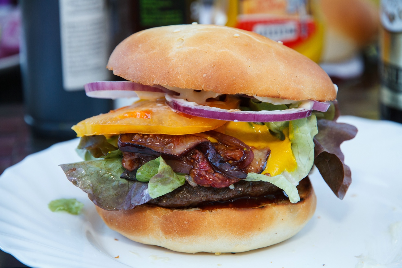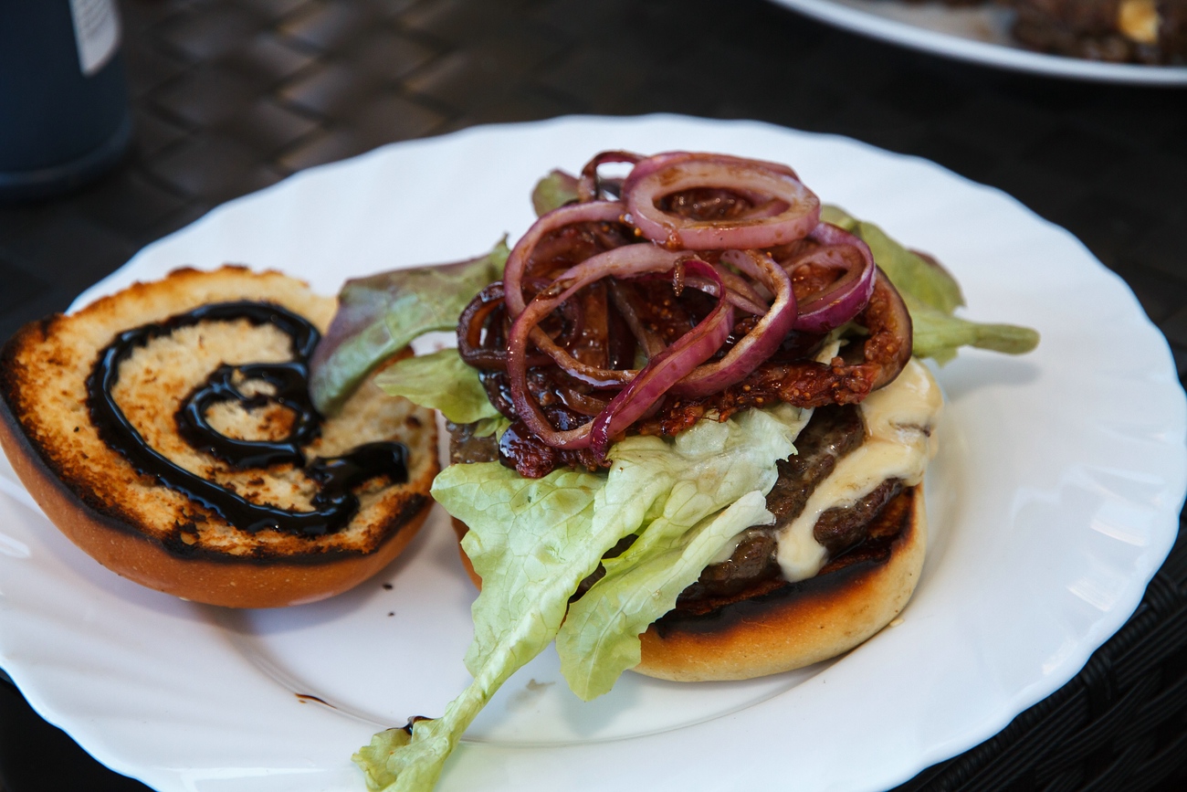 половинки булок тем временем тоже подрумянили на решетке. смазываем их кремом бальзамико, ну и строим собственно бургер из мяса, салата, инжира и лука
