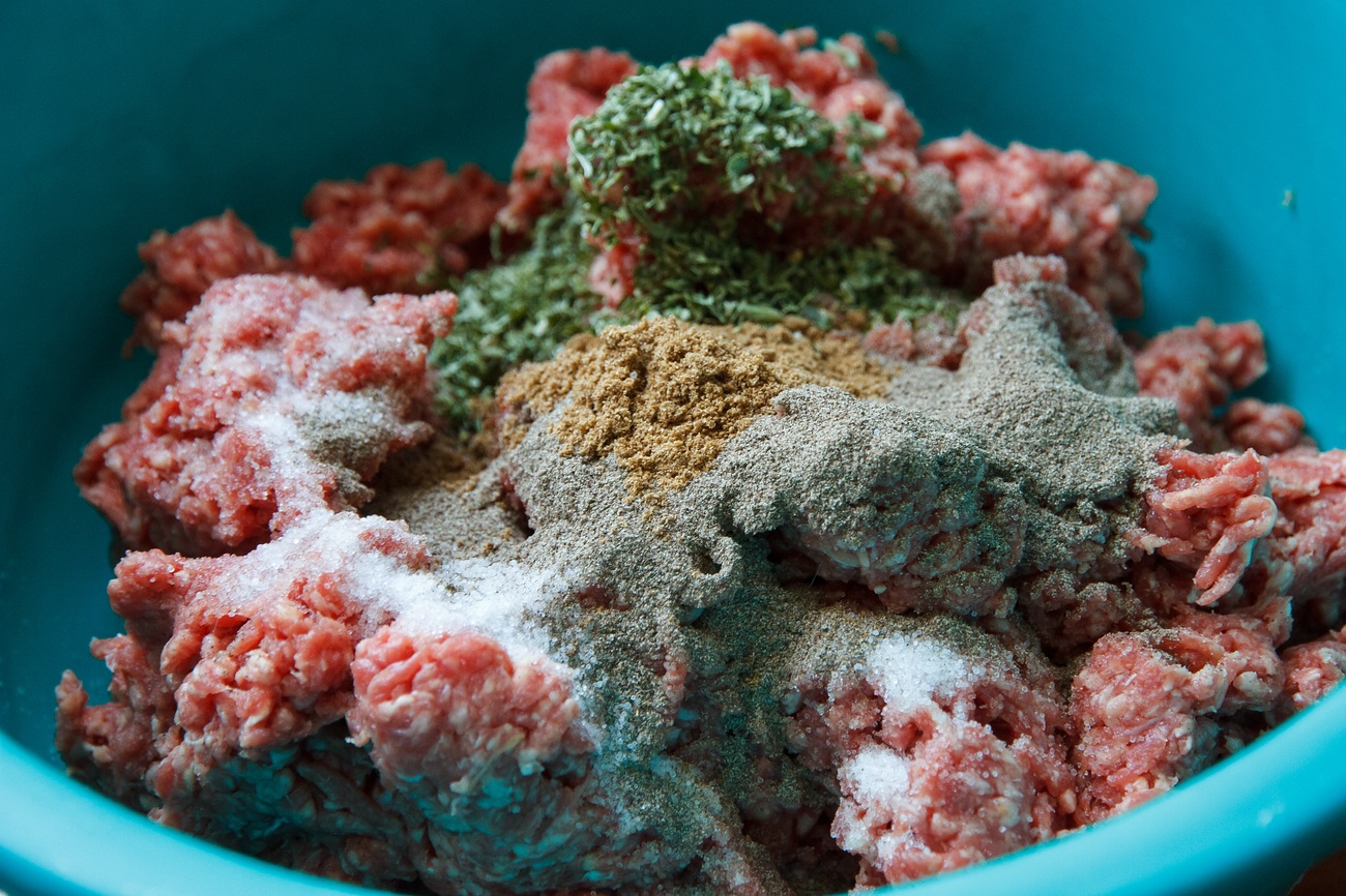 добавляем специи в фарш, слегка перемешиваем. фарш не должен липнуть.