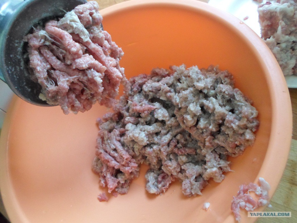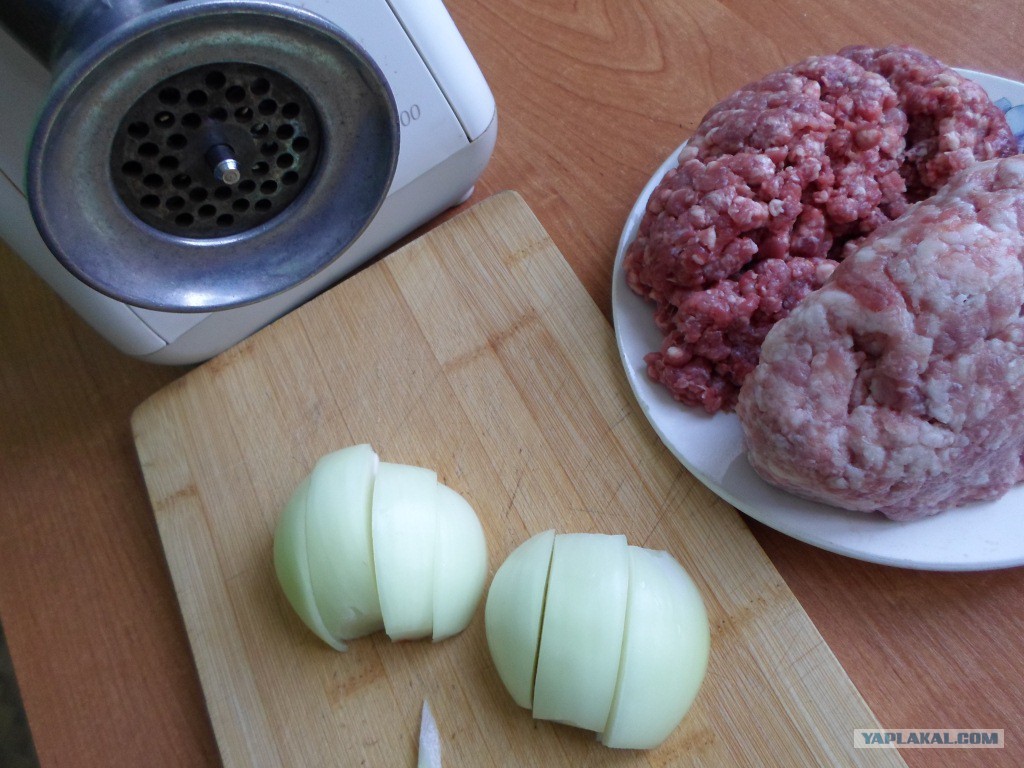 Сначала, смешаем два вида фарша и лук. Думал покрошить лук, но будет фракция крупная и будет выделяться в фарше. Решил все через мясорубку интегрировать.