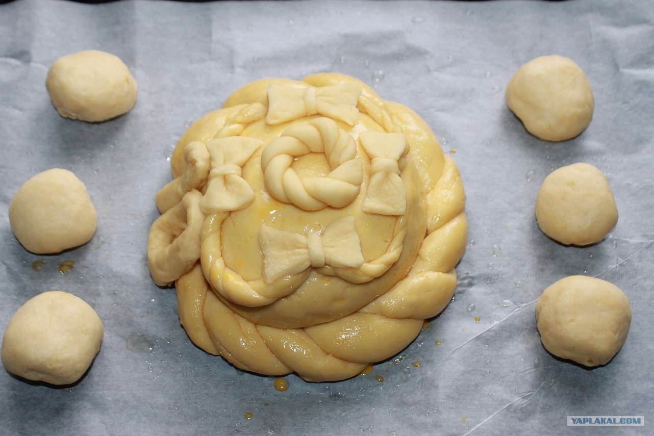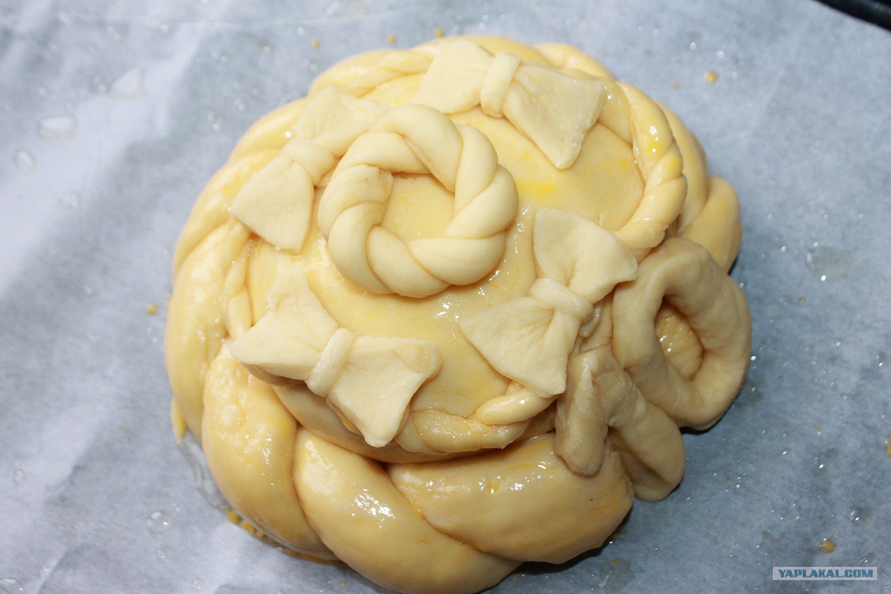 В конце смазала желтком разведённым водой и закончила украшать.