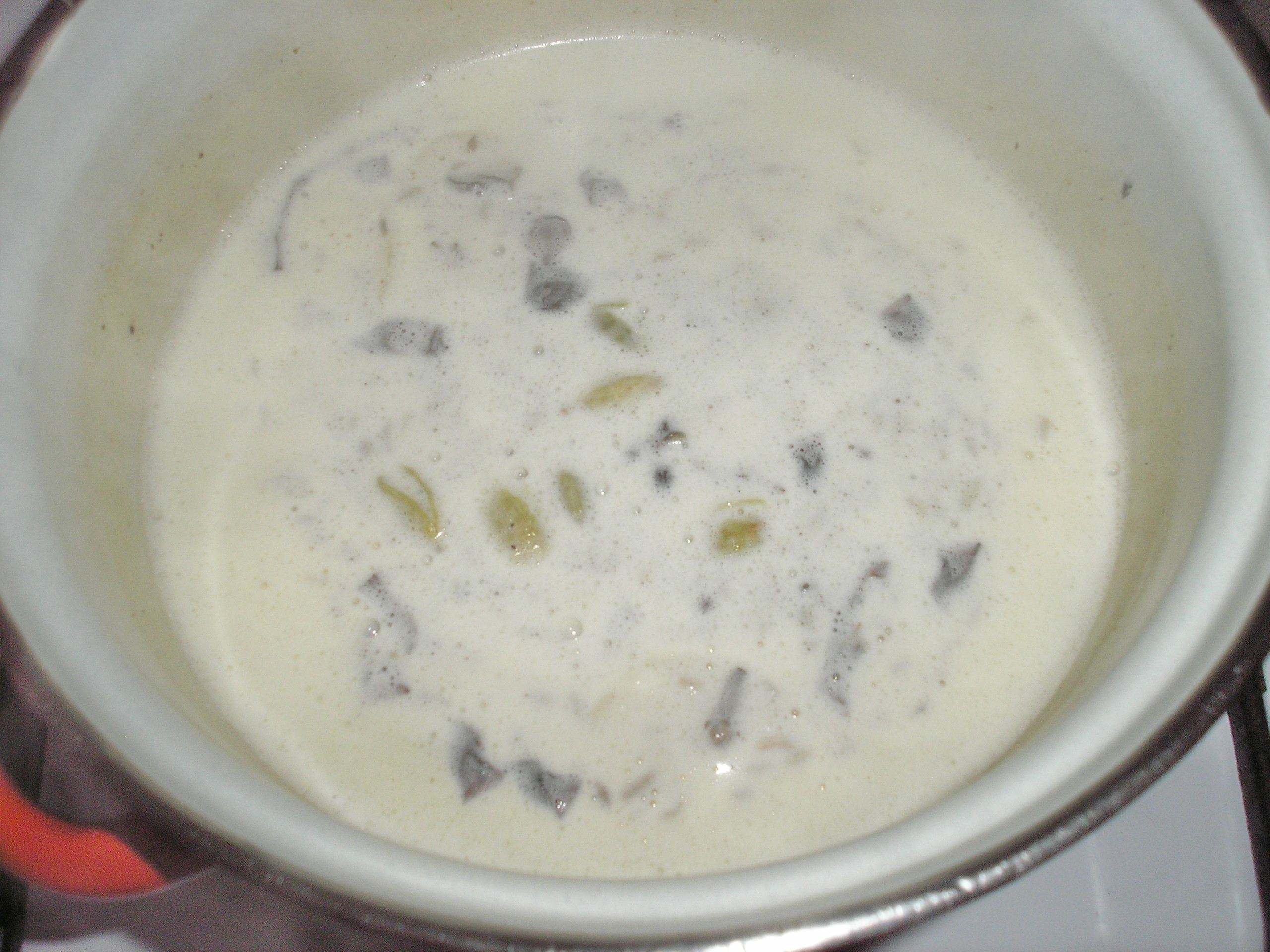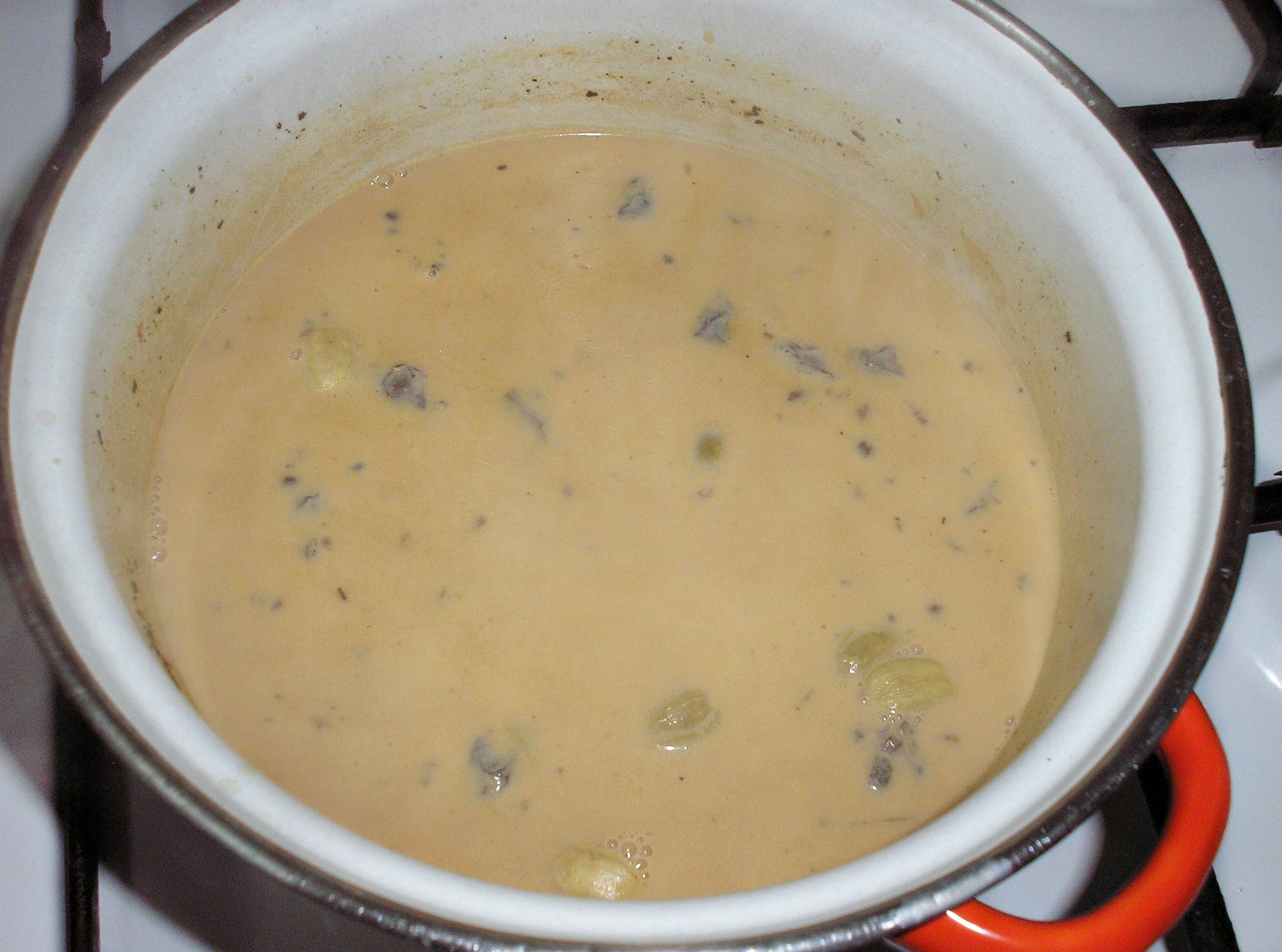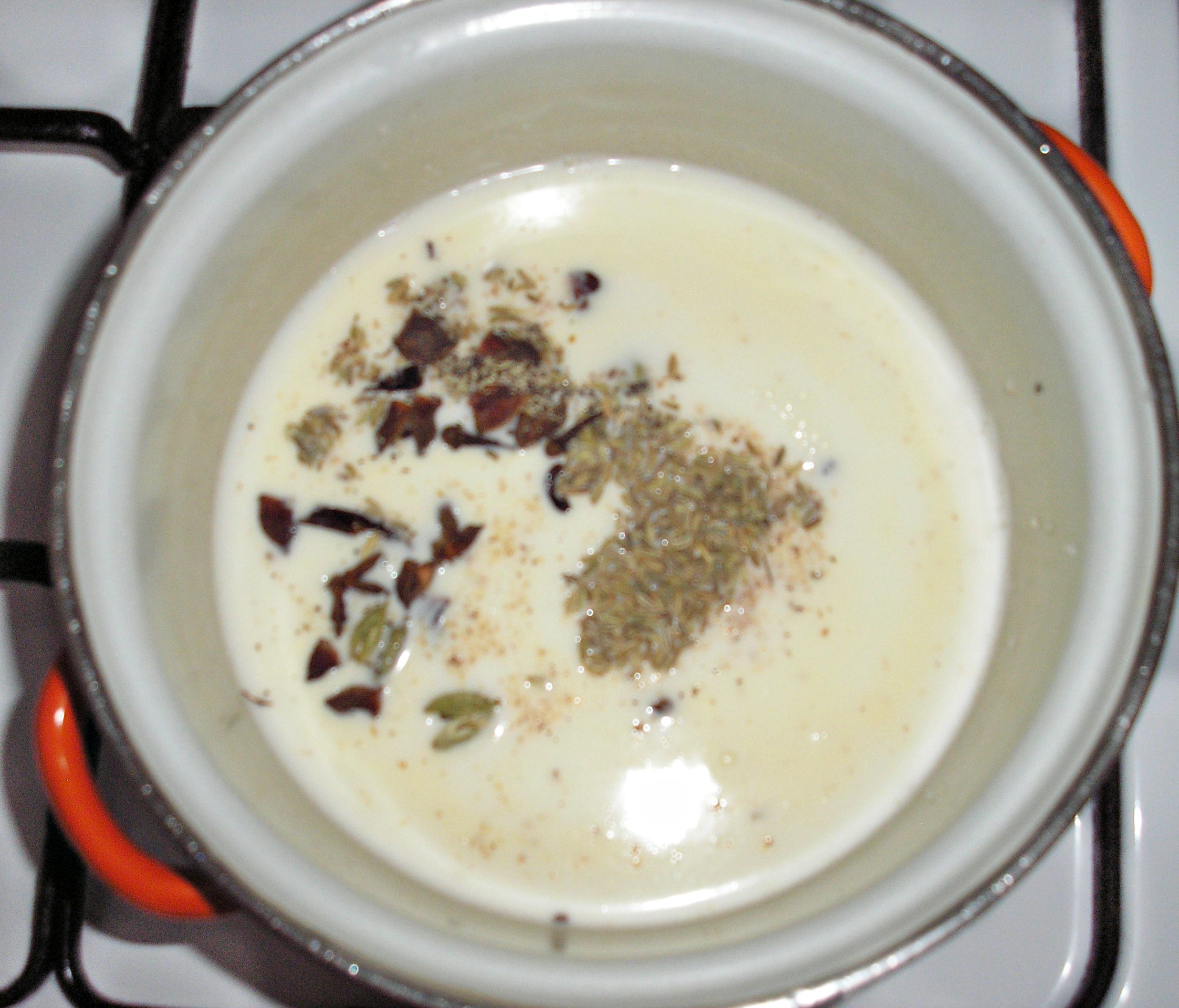 Всё, дальше собственно и объяснять особо нечего. Смешиваем в кастрюле воду, молоко, сливки и специи (фотка говно, но главное понятно):