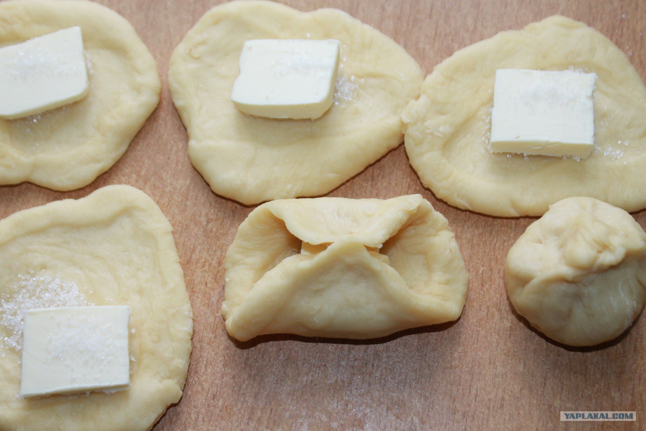 Размяла в лепешку, в середину положила кусочек масла и посыпала сахаром. Залепила края и выложила на противень радом с караваем стыком вниз.