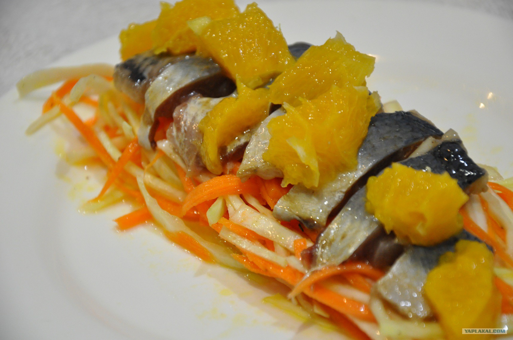 Не, ну это совсем другой коленкор. Настоящая селедка, да еще с апельсином! Разрыв шаблона. Браво. Но рискованно это, да. Но перед повтором втихаря от всех я хочу спросить - Маринованную в апельсине морковчу я ещё могу представить, но капусту нет. признавайся как на вкус? Да ещё с селедочкой под апельсином.
