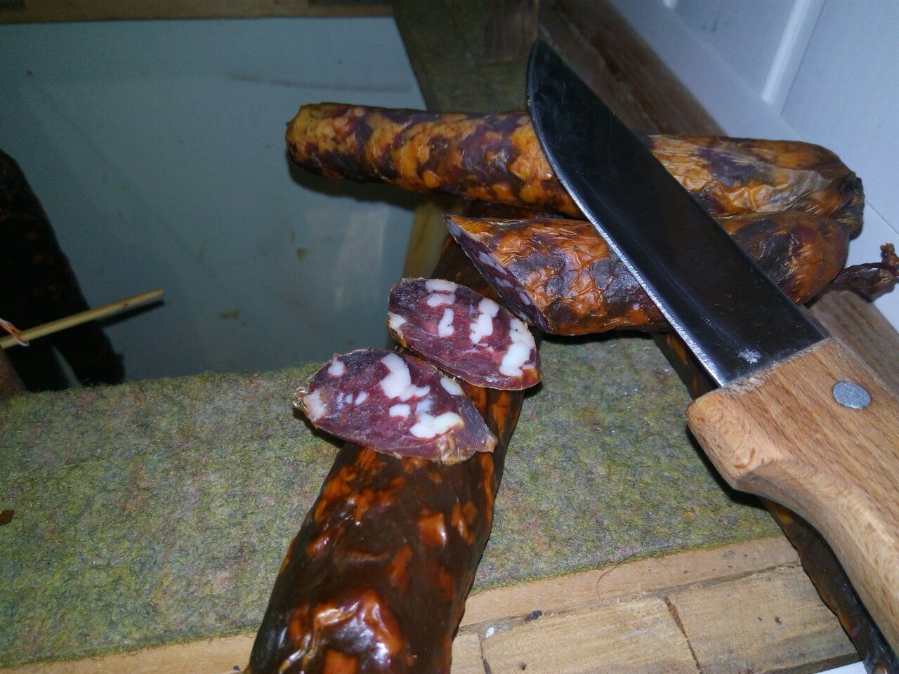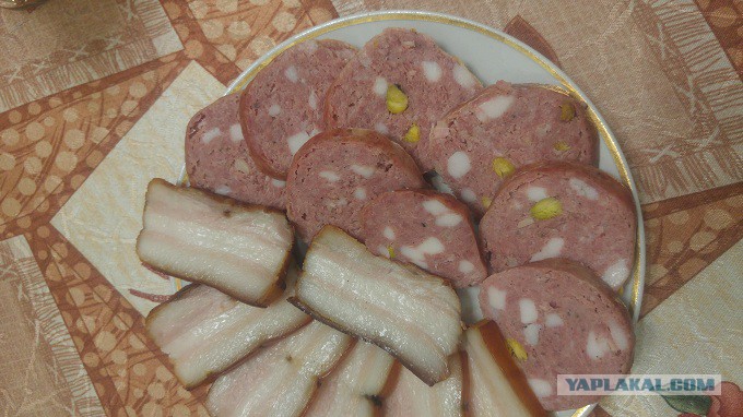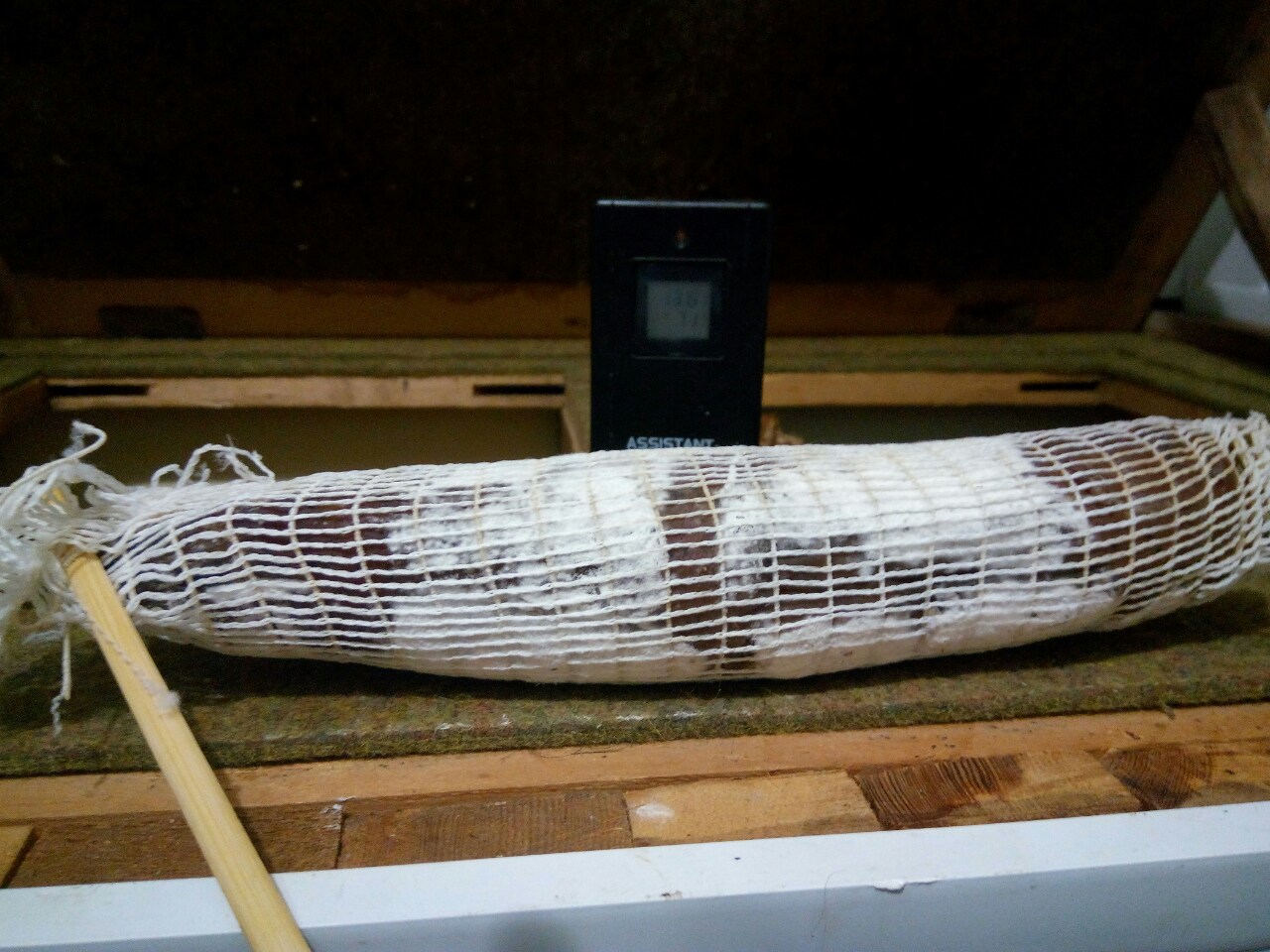 колбаса пока пробник в тонкой кишке, руки чешуться зарезать настоящую 45го калибра, она на фото подставкой служит)) но еще дней 10 надо вытерпеть