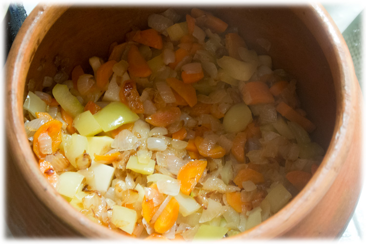 Процеженным бульоном заливаем все, накрываем крышкой и в духовку на слабый огонь, пущай томится часа полтора.