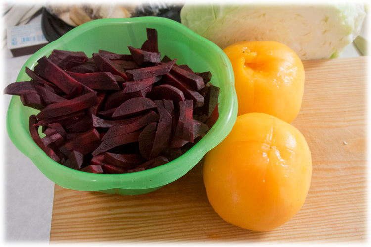Свеклу нарезаем соломистыми кусками, помидоры раздеваем. не гоже в одежде вариться. И да, это не ошибки цветопередачи, мама у меня садовод экспериментатор (теперь я понял в кого я))), любит всякие интересные штуки, вот и помидору желтую выращивает. Абрикосы умудрилась в средней полосе вырастить... я уж не говорю об арбузах и физалисе.
