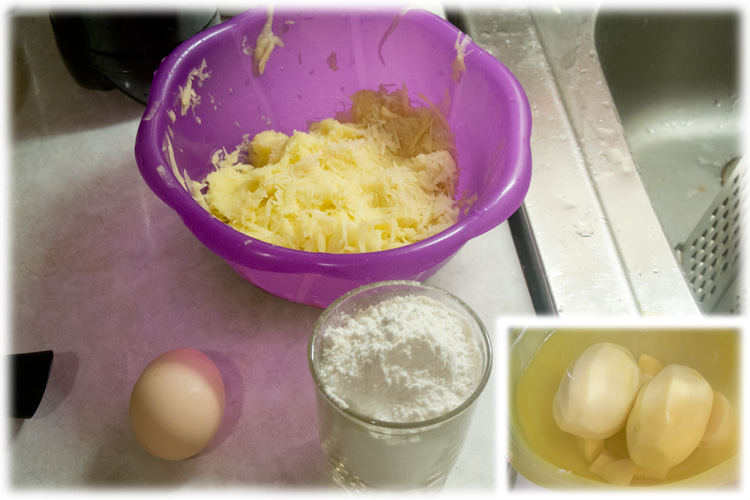 Берем картофель, вон на 2 такие картофелины берем одно яйцо и практически стакан муки. Вот тут я надеюсь белорусы меня поправят если чего, может я чего лишнего положил, а то в моей теме про мега колдун с большим куском мяса рассказали что такое. а как лепить не сказали)) Так что импровизация. И да, я лентяй, не стал варить потом мять. Одну картофелину на мелкой терке, одну на крупной. Но можно все и на мелкой. Однороднее будет, но я люблю с крупными частями.