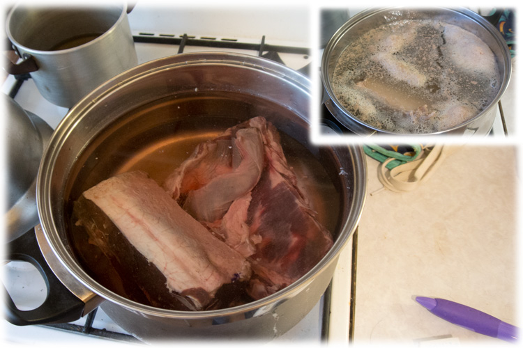 Искать в 8мь вечера хорошую говяжью косточку для супа задача из непосильных, поэтому достал я костляво-мясных элементов оленинки. Позвоночник и еще какая-то часть, вроде лопаточная, копать можно ей. Заливаем на 2/3 водой колодезной и поехали. Пенку снимаем, водички добавляем, пенку снимаем водичку... и так 3 раза.
