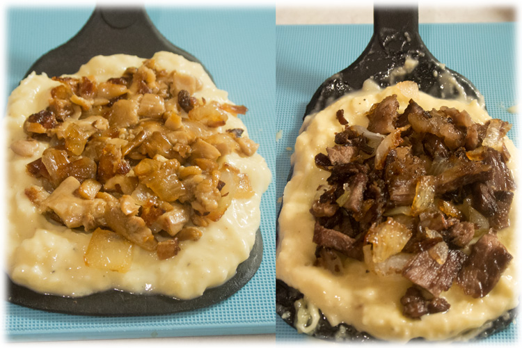 Я не знаю как их делают, может просто с тестом начинку перемешивают, может еще какие способы есть, предполагаю что на руках это можно делать, но не стал я пачкаться и делал следующим образом. На лопатку выкладывал тонким слоем "тесто", сверху начинку, и потом укрывал опять "тестом". Но надеюсь опытные мне расскажут что я делаю не так))
