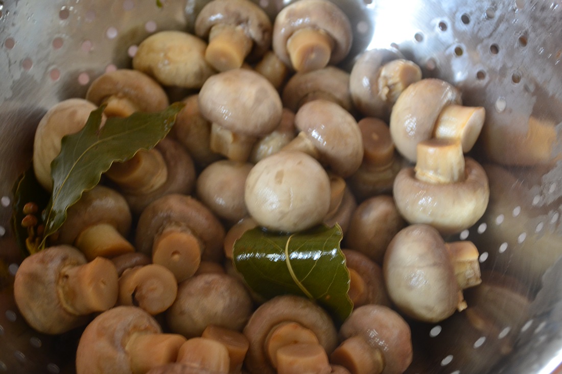 6. Грибы сварились. Откидываем их на дуршлаг и промываем холодной водой. Даём как следует стечь. (Интересно…. Если кипятком, то ошпариваем! А если ледяной водой? Чё за слово то?)