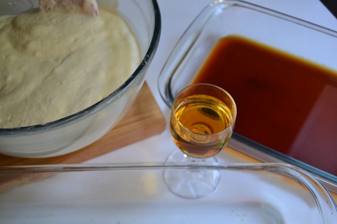 В плоскую форму или тарелку выливаем кофе и добавляем коньяк.