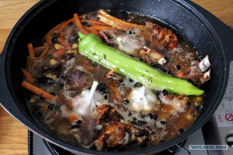 Теперь заливаю всю зажарку холодной водой пальца на 1,5-2. Воды желательно лить столько, чтобы в процессе варки зирвака не доливать больше. При этом помним, что часть воды будет испаряться, но и соки из продуктов тоже будут выделяться. В общем, тут надо опытным путём вычислять cool.gif Добавляю по краям косточки, обжаренные в начале, пусть отдадут весь вкус бульону до капельки. Добавляю 1 ч.ложку зиры (протираю её между ладошками), горстку чёрного барбариса, это абсолютно на любителя, я люблю, когда потом кислинка на зуб попадется. Обязательно чеснок и острый перчик, особого вкуса они не придадут, но будут незаменимы в качестве закуски к плову и украшения блюда.