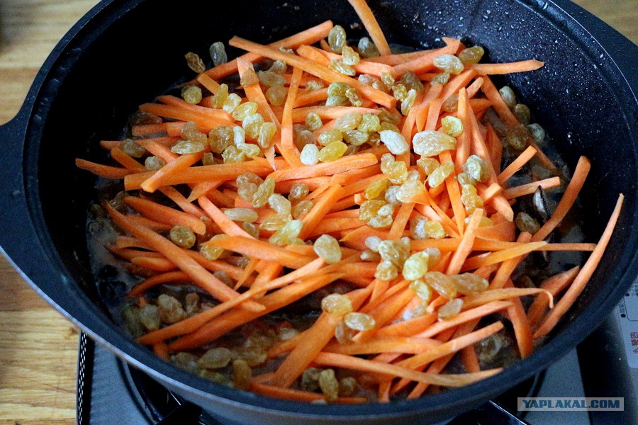 Главный этап — закладка риса. Сначала пробуем зирвак на соль. У меня получилось слегка пересолено, это самое оно. Если просто вкусно, можно досолить. Добавляем оставшуюся морковку и отжатый изюм: