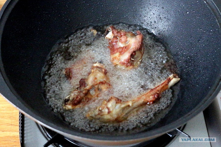 Шкварки затем убираются и используются по всем давно известному назначению. Добавляем к жиру растительное масло, огонь на полную. Как раскалилось, бросаем в казан косточки, пусть обжарятся прямо до хорошей корки (это для хорошего окончательного цвета плова).
