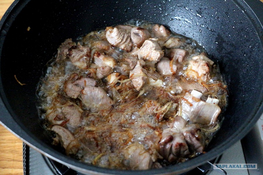 Время закладки мяса и ребрышек, добавляем — лук сразу перестаёт зажариваться. Огонь всё ещё на полную. Мясо обжаривать сильно не стоит, чтобы оно потом хорошо отдавало все лучшее в зирвак. Как только ушла лишняя жидкость, а на кусочках стала появляться корочка — харэ.