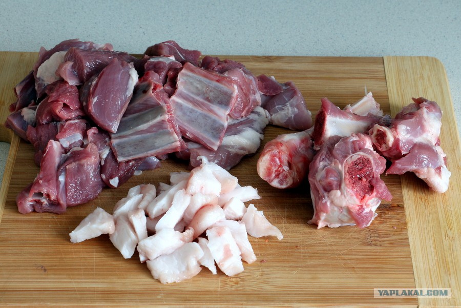 Мясо разделила на три кучки. В одной мякоть и рёбрышки, в другой косточки, очищенные от мякоти, а третья — курдюк небольшими пластинками.