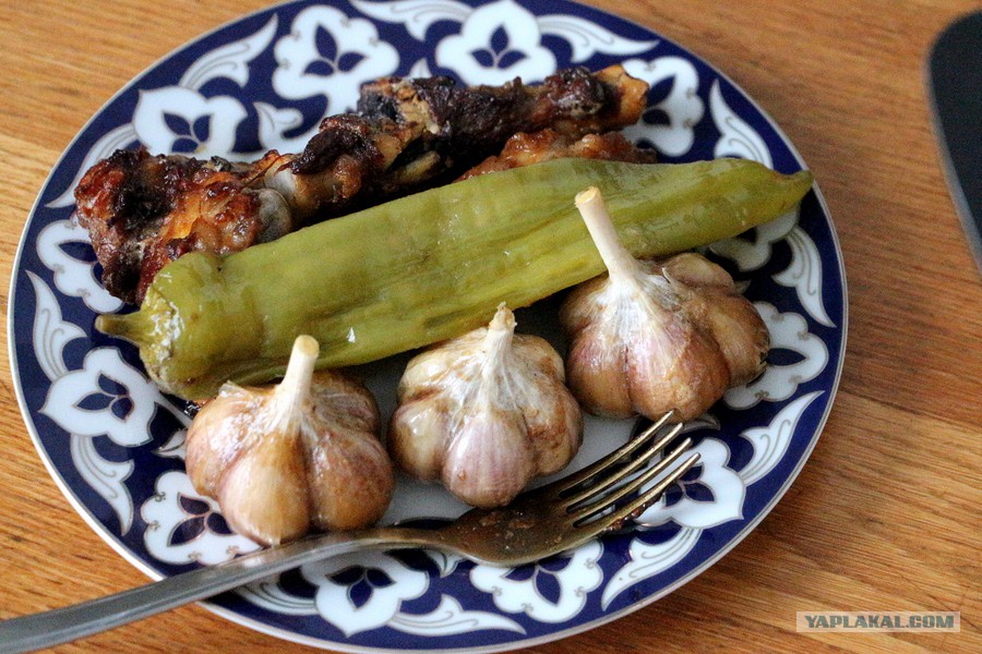 Открываем крышку. Первым делом я отложила чеснок и перчик, потом аккуратно вытащила из-под низа куски мяса на тарелку. Оставшийся рис, а, точнее говоря, собственно плов, осторожно перемешала от краёв к центру казана, чтобы масло снизу равномерно распределилось по суховатому рису сверху. Тут же выкладываем на ляган горкой. Сверху кладу мясо, рёбрышки, украшаю чесноком и перцем. По краю можно положить слатик ачик-чучук (если бы он у меня был из красивых и сочных помидоров, я б обязательно положила), гранатовые зёрнышки, яйца, всё, что вам захотелось.