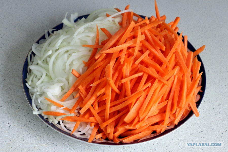 Морковь нарезала тонкой длинной соломкой, а лук полукольцами.