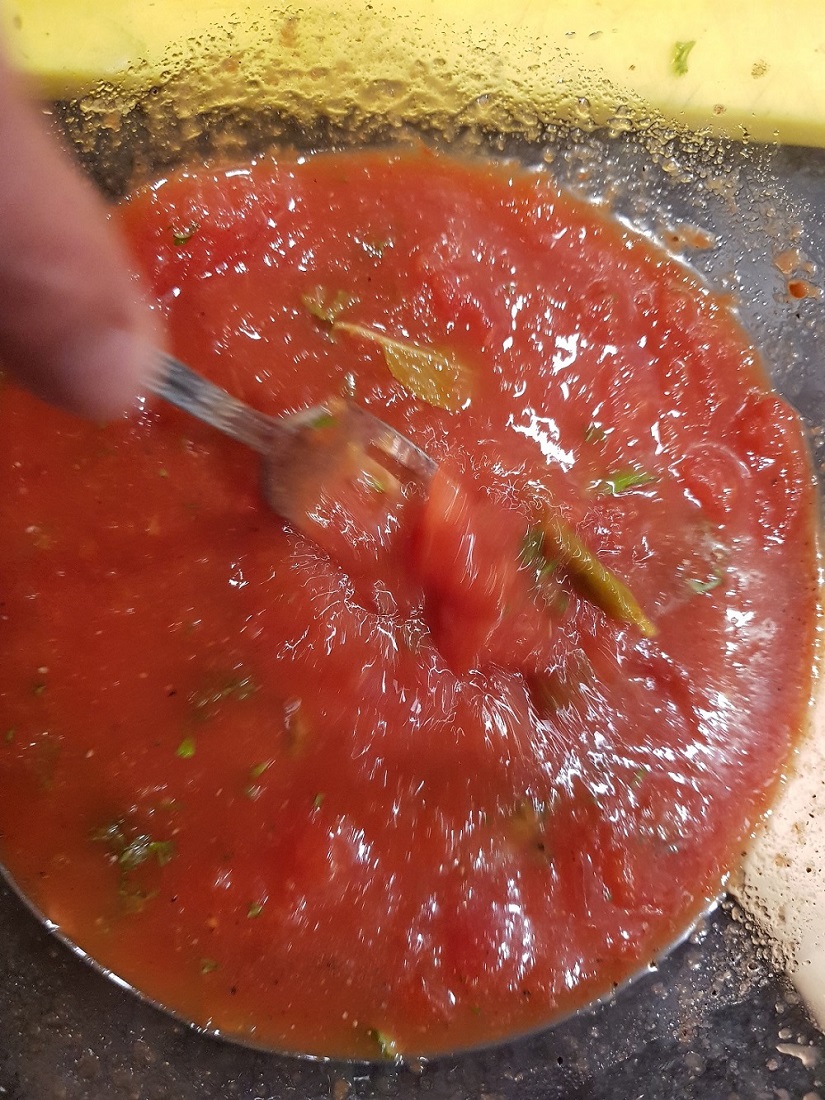Заморачиваемся с помидорами. Их рубим по возможности меееелко-мелко, вливаем стекший сок от выпотрошеных внутренностей, добавляем немножко базилик и петрушку. Не стану врать, помидоров показалось маловато, а снова чистить-вынимать было уже неохота, поетаму просто-напросто влила еще бутылочку готовых свекрухиных, такой вот грех за мной теперь.