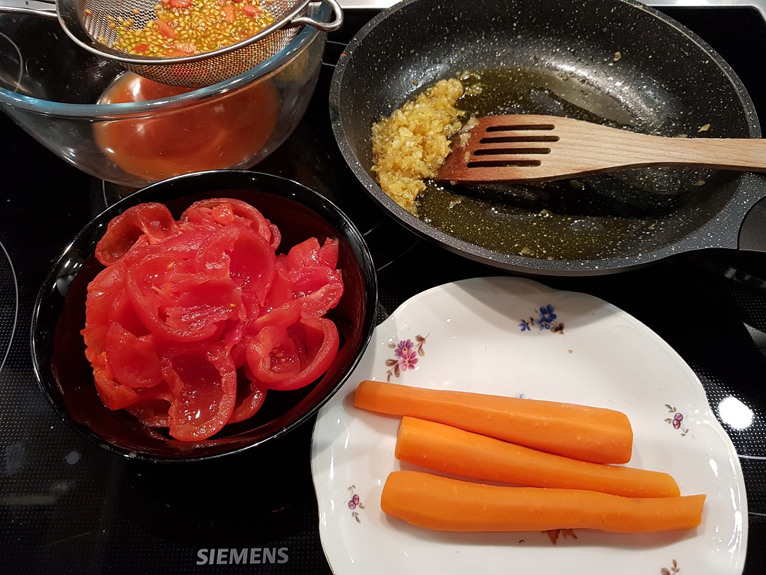 . Лук режем и нееежжжно обжариваем, морковку обвариваем до состояния ал-денте, а вот с помидорами пришлось попотеть. В силу кулинарных и других причин личного свойства я томаты всегда чищу от шкурки и от семян. Муторно шопесдей, но результат того стоит, я считаю, соус воздушнее.