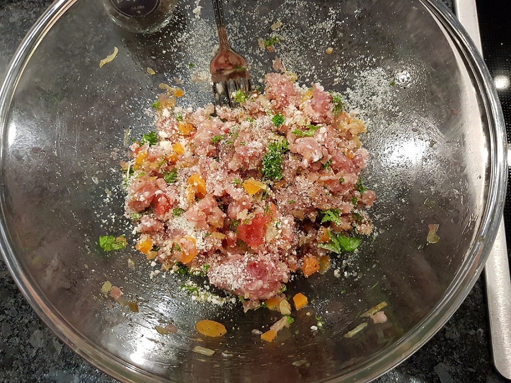 Тут вот куда как проще: берем наш фарш ( тут внутренности гриль-вурста), солим-перчим (если ето свежий фарш), чуть-чуть томата рубленного, морковки такой же, листья сельдерея и петрухи для оживляжу и мало-мало пармезану для понтов и запаха))) и обжаренный лук туда.