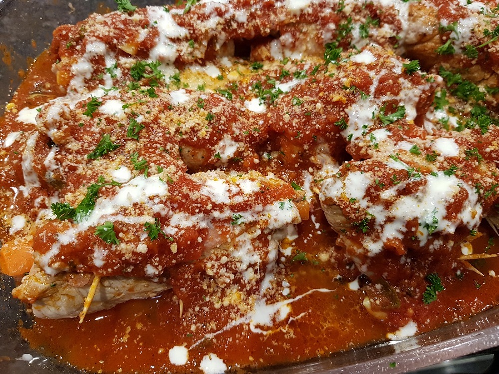 их сверху заливаем еще много соусом, посыпаем петрухой и пармезаном. Тут можно бы и упокоиться, но наш соус вышел кисловат (памидоры были такие, а содой гасить не хотелось), поэтому просто докапали жирных сливок, они вкуса не испортят, а кислоту скроют. И в печку их. На часок так с небольшим при +200 примерно. В процессе разок другой перевернуть и соусом сверху пополить.