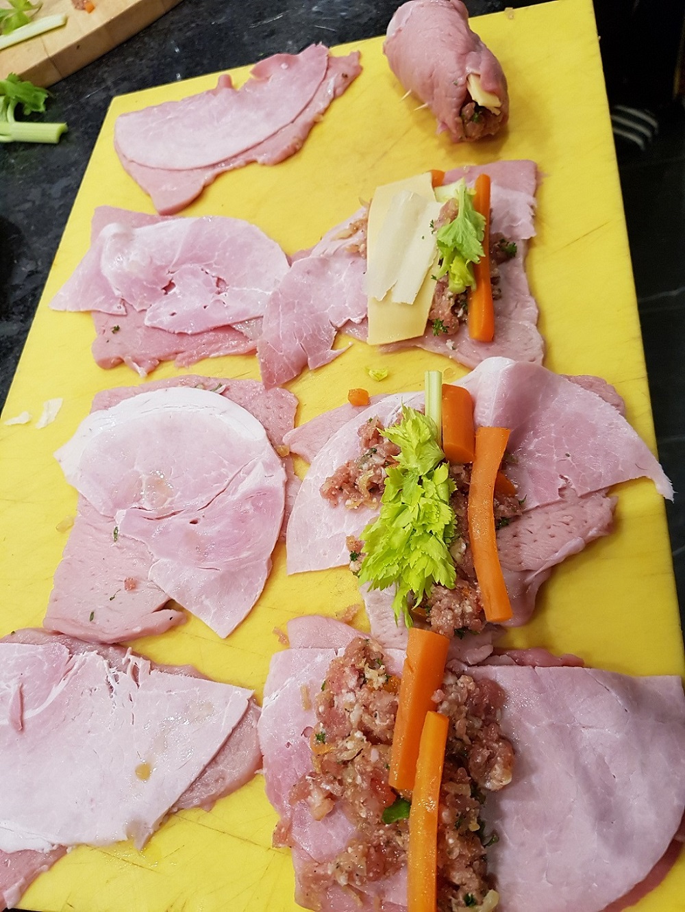 Тут приступаем к главному, все объеденить. В принципе на картинке все видно: на телятину кладем кусок ветчины, на него фарш, в фарш закладываем морковку и сельдерей, добавляя аккуратно отрезанный пармезан. Правда тут у спицальных людей приключился очередной взрыв фантазии, и из закромов был вытащен Гауда +48 (выдержанный мягкий сыр) и тоже туда запихан на всякий случай.