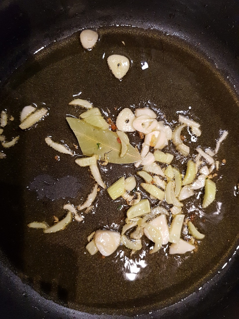 Но штоб время впустую не шло пока мы фарш месим, на сковородочке на очень спокойном огоньке припариваются в смеси оливкого масла и свиного шмальца кусочки стебля сельдерейного сначала, а потом к ним один зубчик чеснока покрошеный, а лавровый лист ваще фиг знает откудова замело, но ето дело такое, можно его и не пускать.